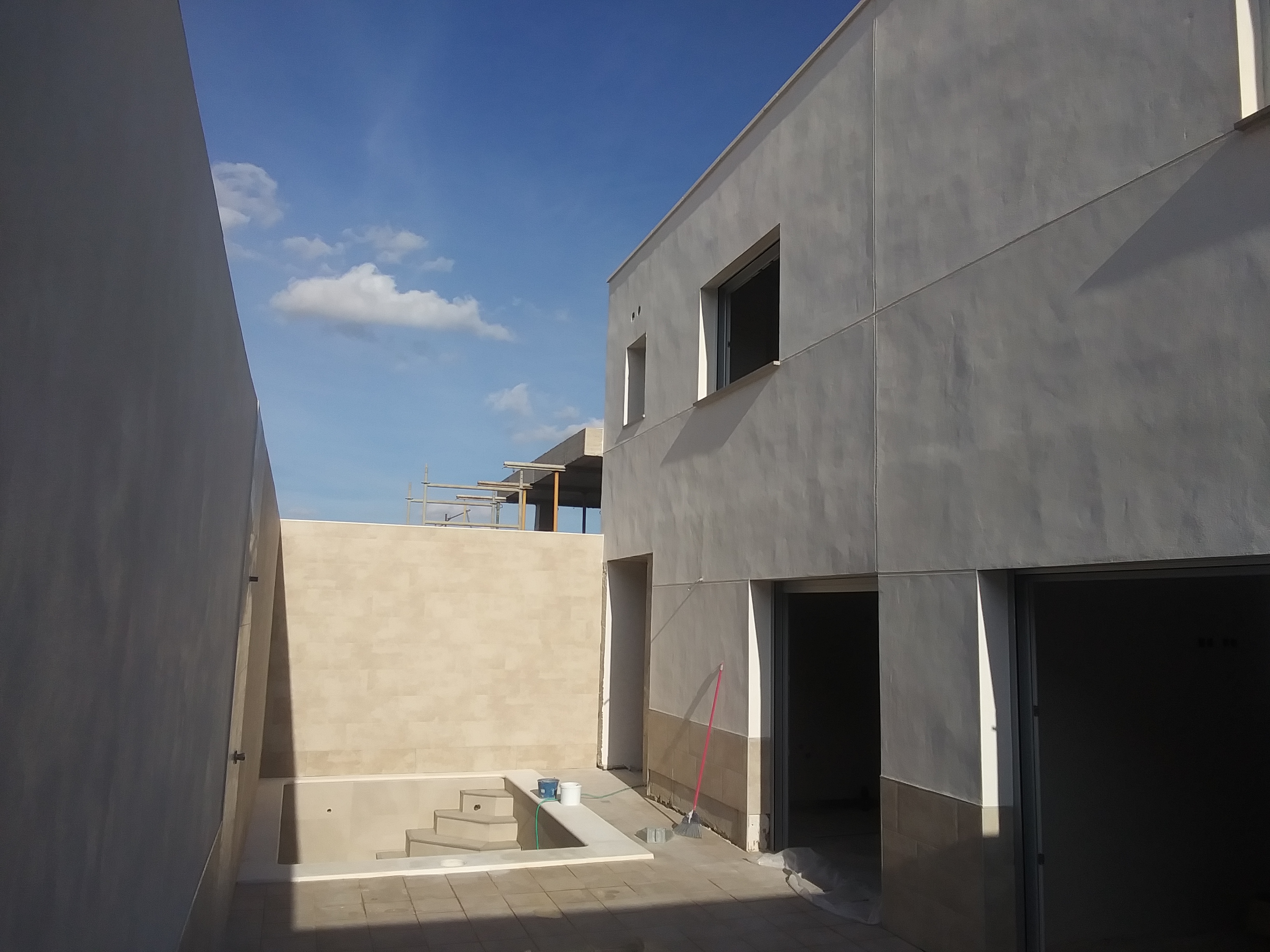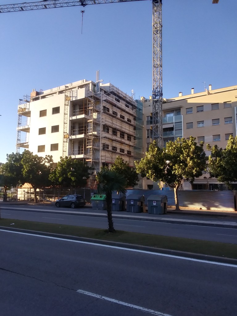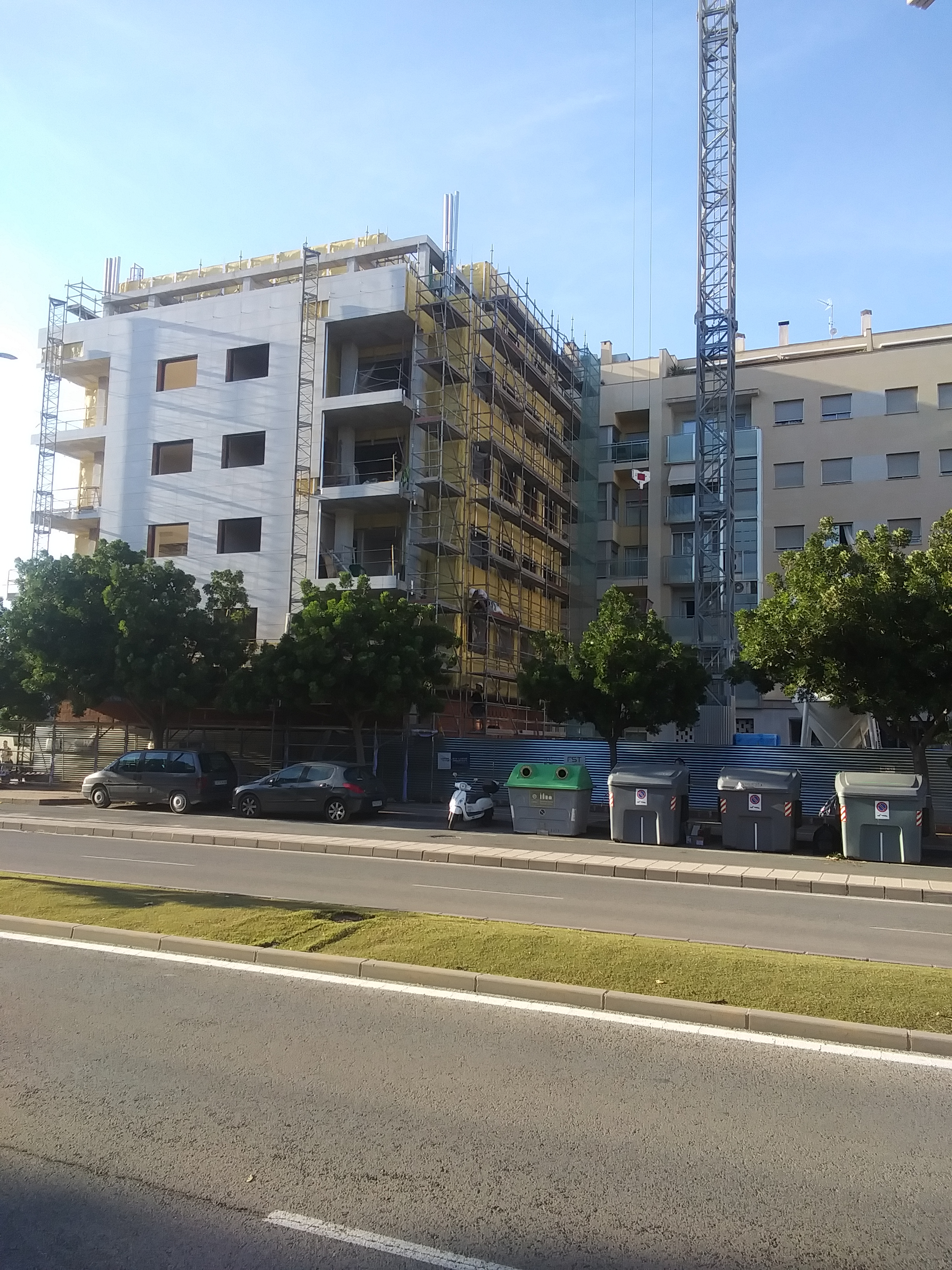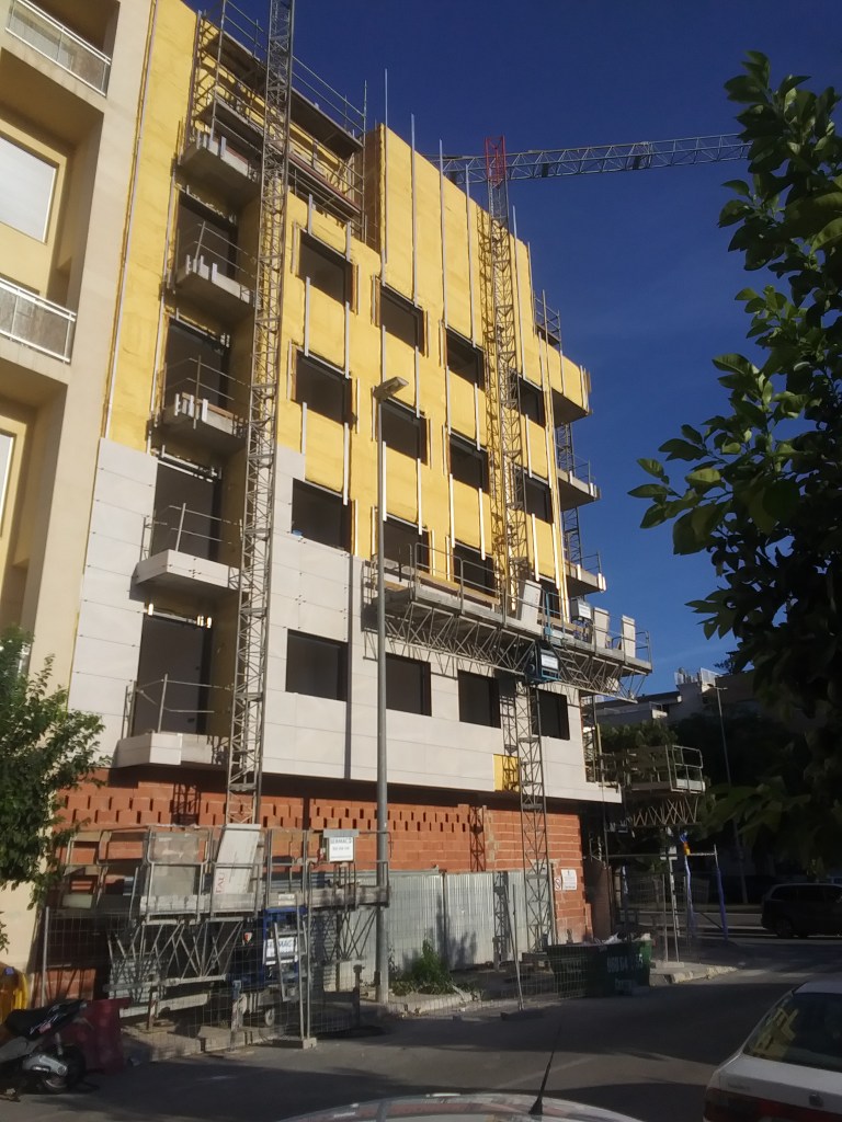 Visita de obra, montaje de fachada ventilada con proyección de aislamiento térmico a base de poliuretano, estructura metálica de sujeción de aplacado de piedra con cámara intermedia de aire.