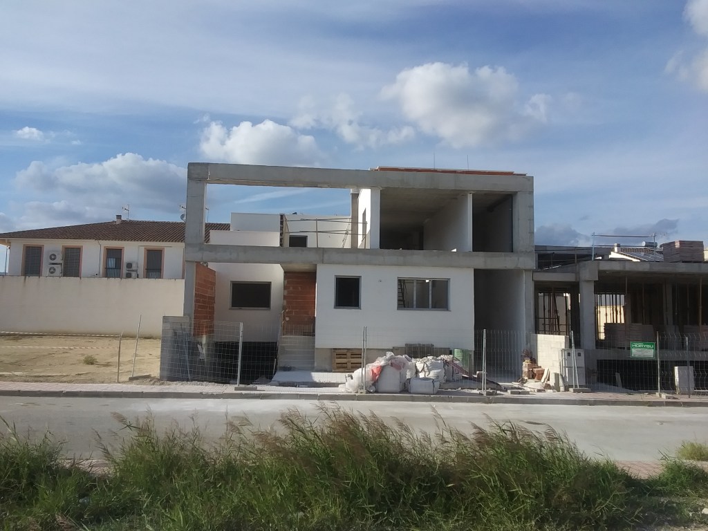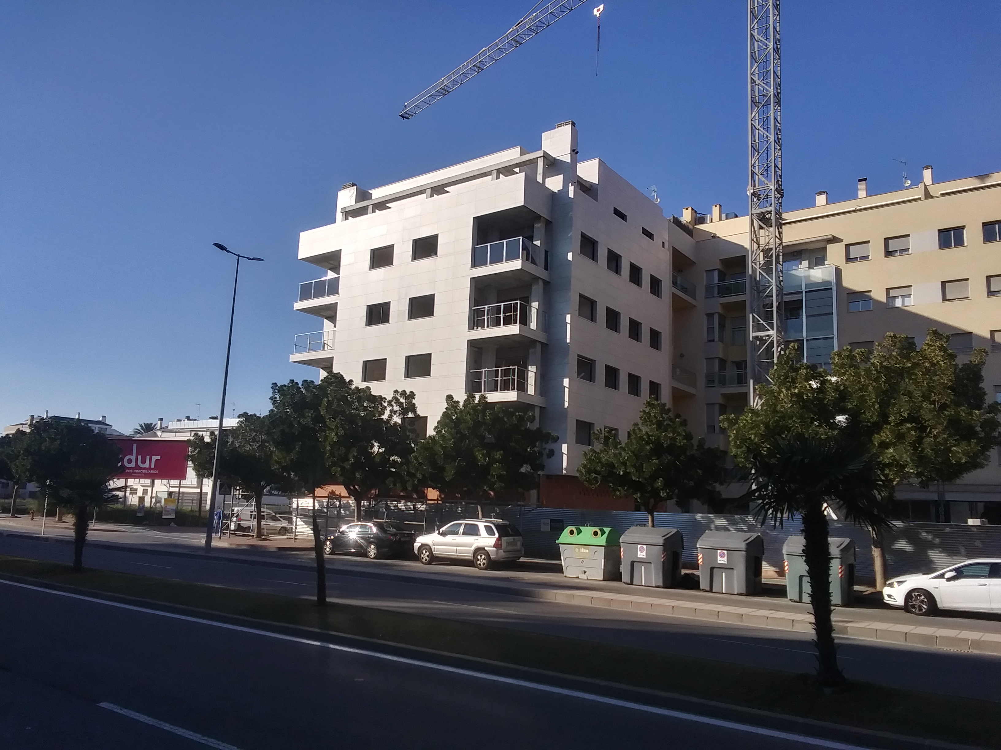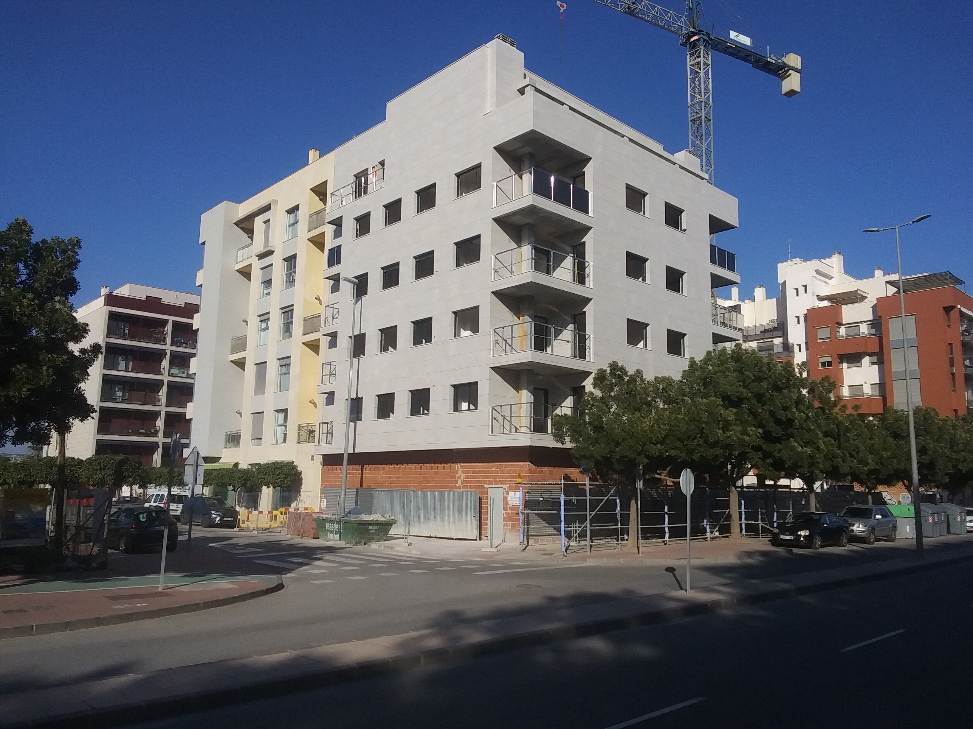 Visita de obra, montaje de fachada ventilada con proyección de aislamiento térmico a base de poliuretano, estructura metálica de sujeción de aplacado de piedra con cámara intermedia de aire.