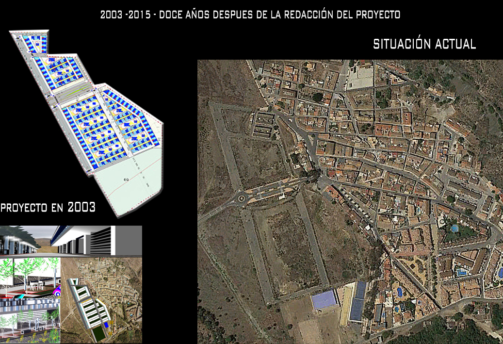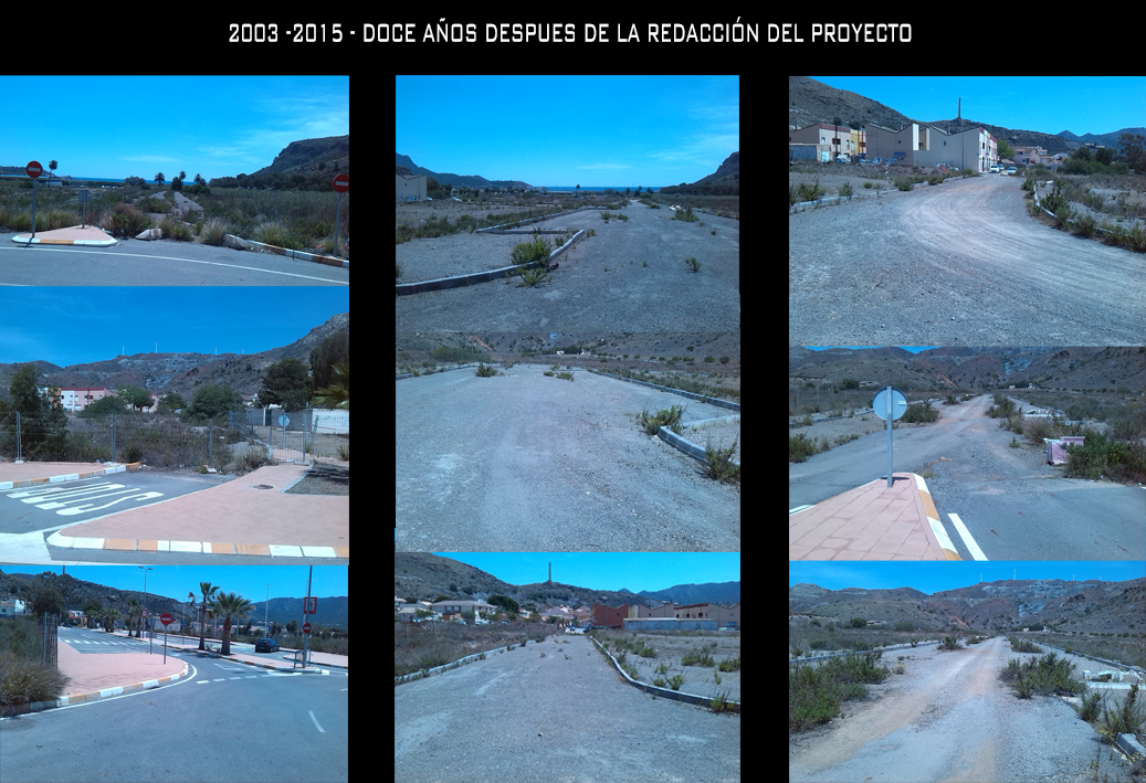 Cual fue mi sorpresa al visitar el lugar, de que toda esa urbanización de ensueño se quedo en nada, como tantas otras promociones y proyectos a lo largo de la geografía española, era una urbanización fantasma. La urbanización quedo a medio, por lo que solo se pueden ver las trazas de las calles sin asfaltar, muchas de ellas llenas de matojos, solo los los bloques de hormigón que marcan las aceras y el árido permiten vislumbrar que allí se proyectarón una calle. La calles totalmente cortadas por vallas metálicas con alguna traza de la red de alcantarillado. Todo era como en esos programas que relatan el resultado de la crisis económica y el pinchazo de la burbuja inmobiliaria. De todo aquello que proyecte solamente la entrada al pueblo ha sobrevivido con una nueva rotonda y una zona pavimentada con aparcamientos y aceras. Espero que hayamos aprendido de todo ello y que esto nos ayude a ser mejores arquitectos.