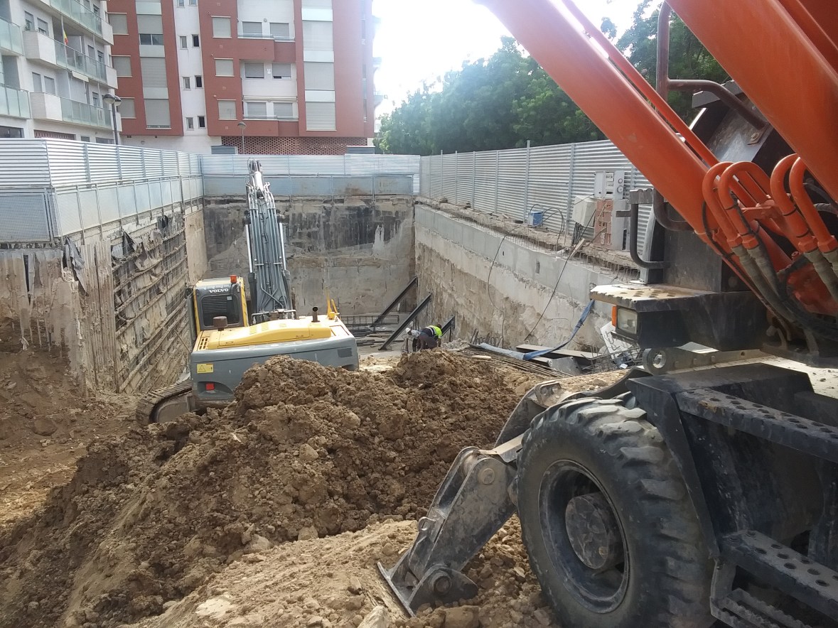En proceso de excavación por bataches con bermas, construcción de losa de cimentación y arriostramiento con perfiles metálicos al muro pantalla en el proceso de construcción de la cimentación.